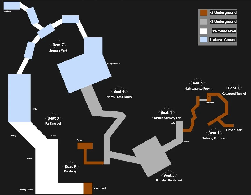 After 6 iterations, the final blockout ended up with 9 level beats with a focus on pacing and player interactions.