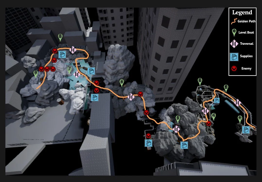 By using Pacing & Flow techniques, the player becomes more engaged with the level when the level’s layout focus on key gameplay encounters that have been staggered to avoid repetition.